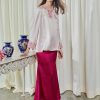 Details: Loose traditional Kedah top paired with Front Pleated skirt. 100% Silk. Hand-painted silk and Sulam Goyang.