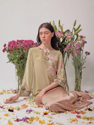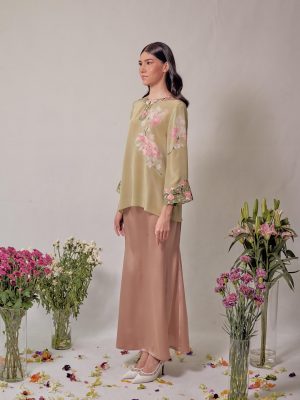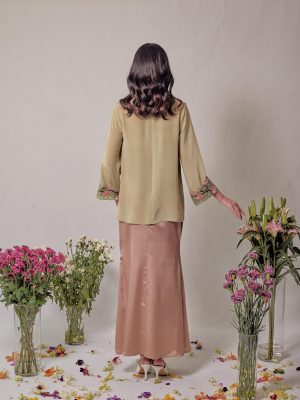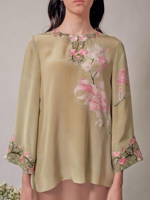 Hand painted magnolia flower batik in olive made of satin sillk.