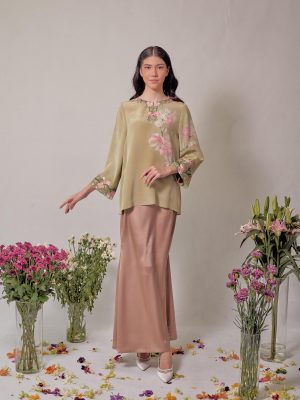 Hand painted magnolia flower batik in olive made of satin sillk.
