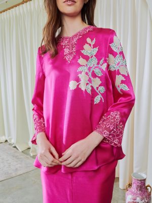 Details: Loose traditional Kedah top paired with Front Pleated skirt. 100% Silk. Hand-painted silk and Sulam Goyang.