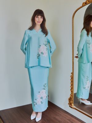 Details: Loose Modern Kedah top paired with Back Pleated skirt. 100% Silk. Hand-painted silk and Sulam Goyang. Beaded French Lace on the chest area.
