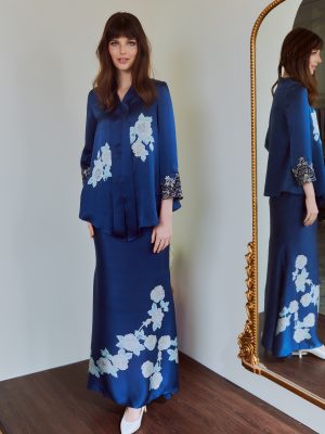 Details: Loose Kebaya top paired with mermaid skirt. 100% Silk. Hand-painted silk and Sulam Goyang. Care Instructions: Dry Cleaning only
