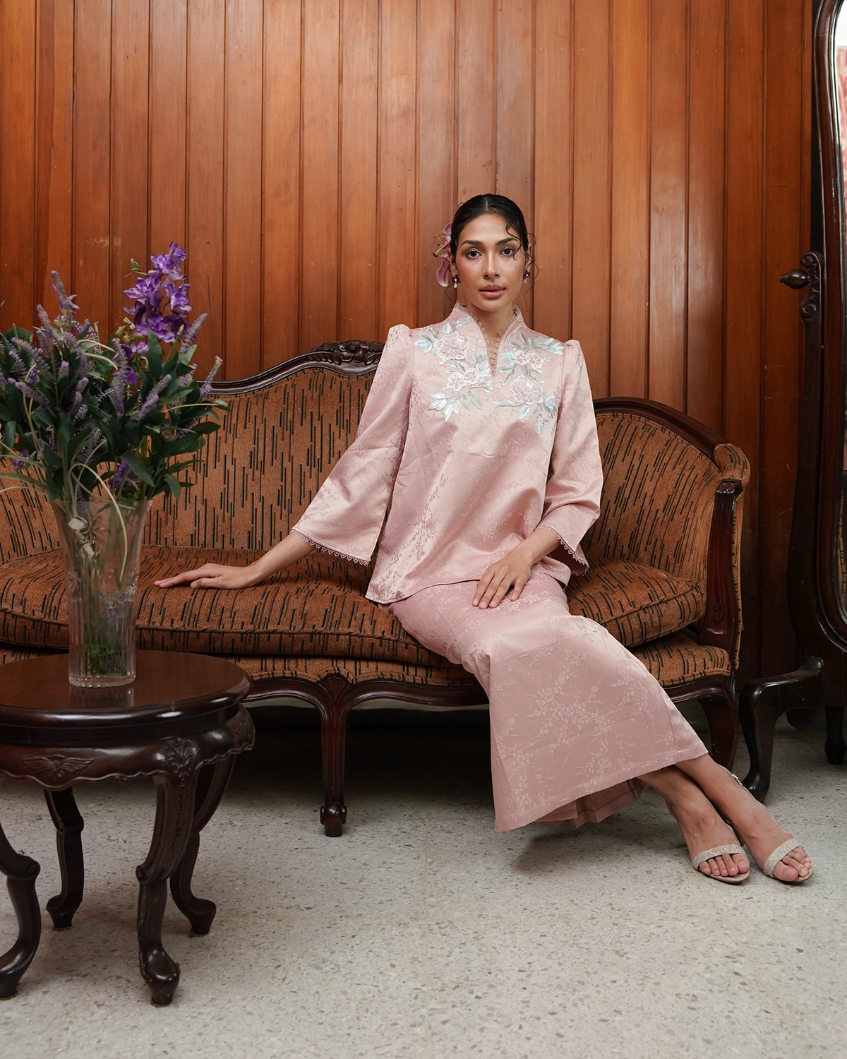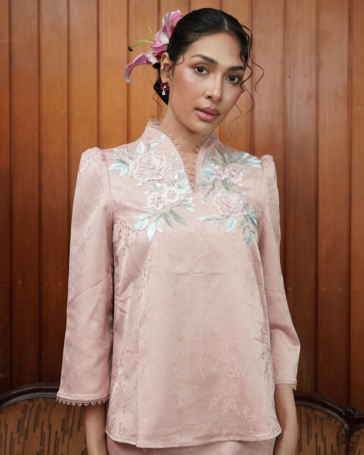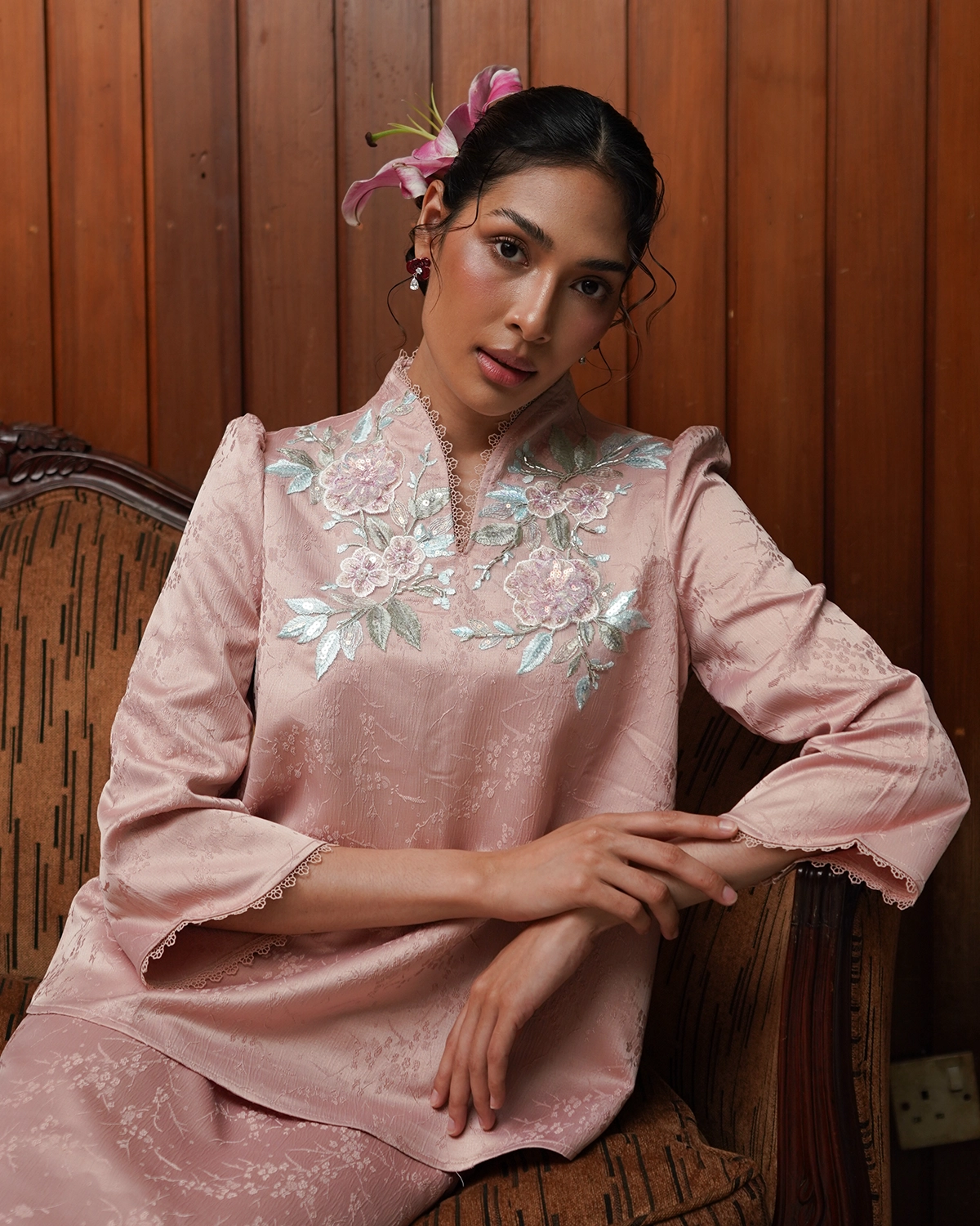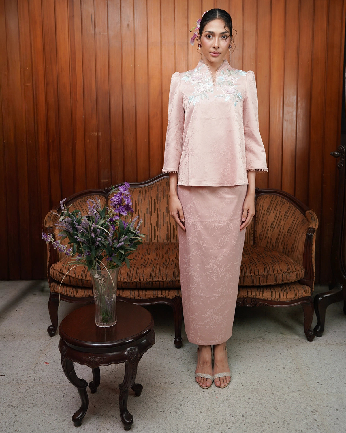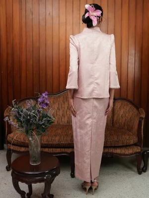 Delina is made with love with cute & playful detail. Soft brocade adorned with intricate applique flower, finished with subtle puff details that adds a charming look on the first day of raya