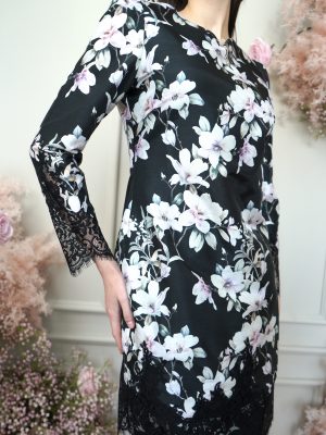 Lace detailing on sleeves hem and below top.