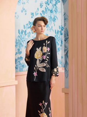 Carefully curated batik on satin silk with the delicate sulam goyang detailing .