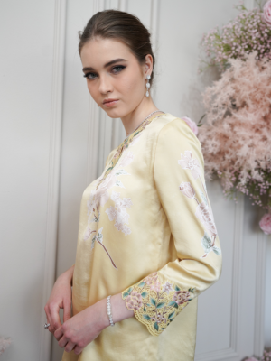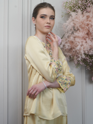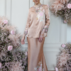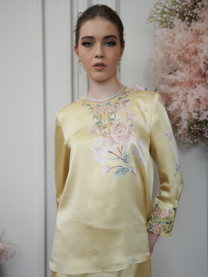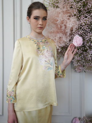 Carefully curated batik on satin silk with the delicate sulam goyang detailing .